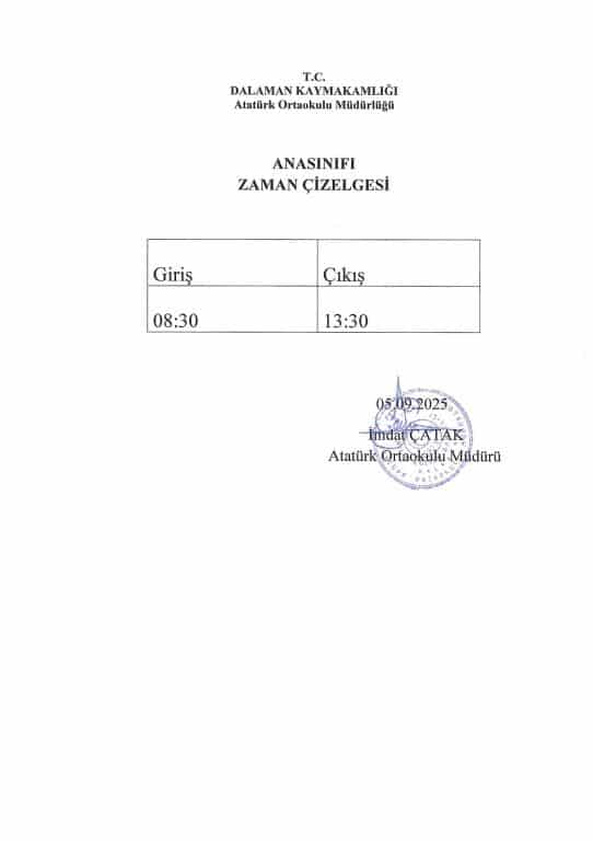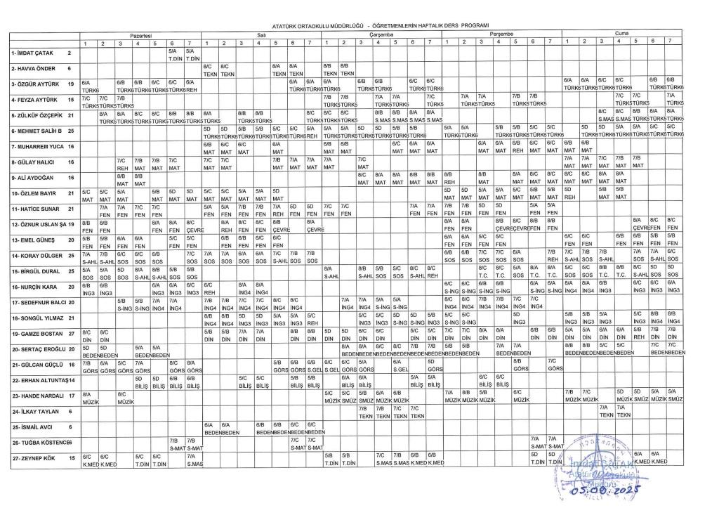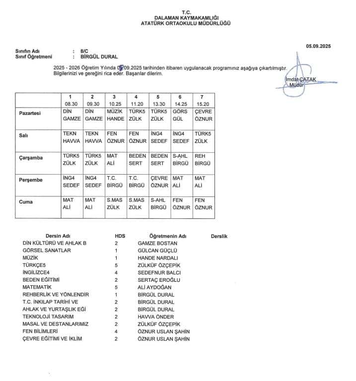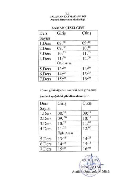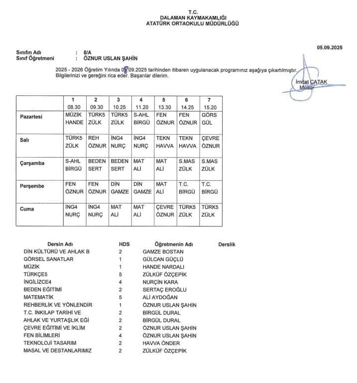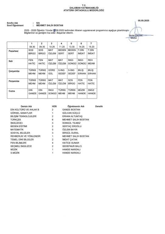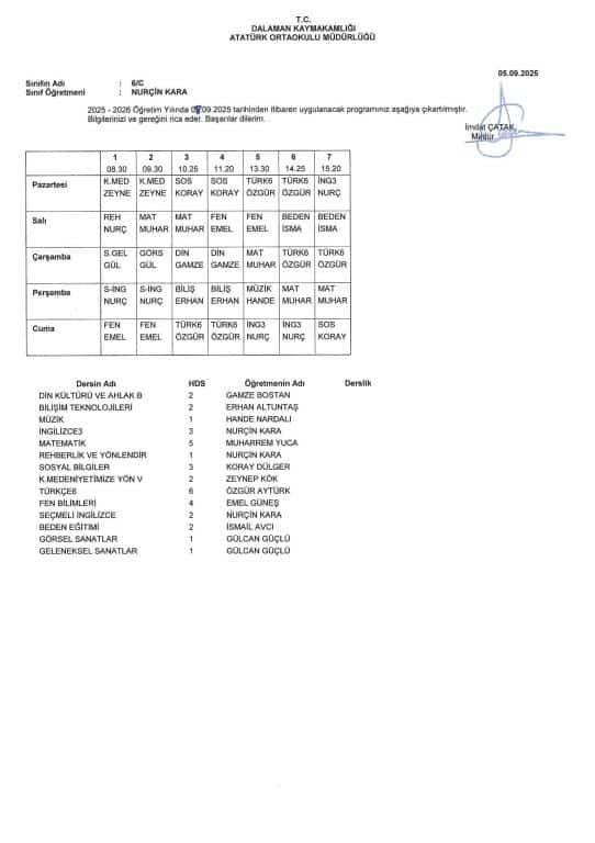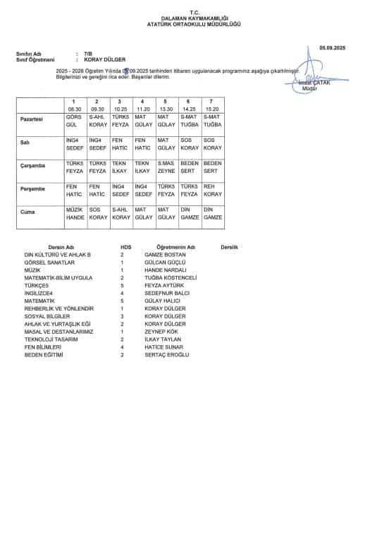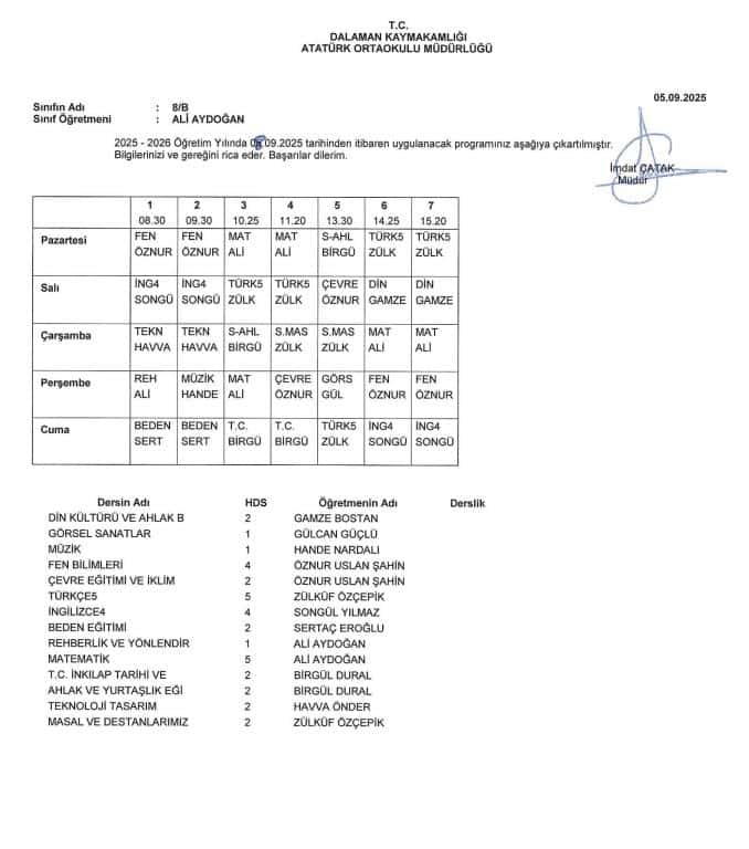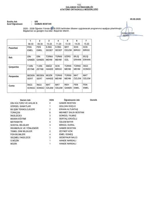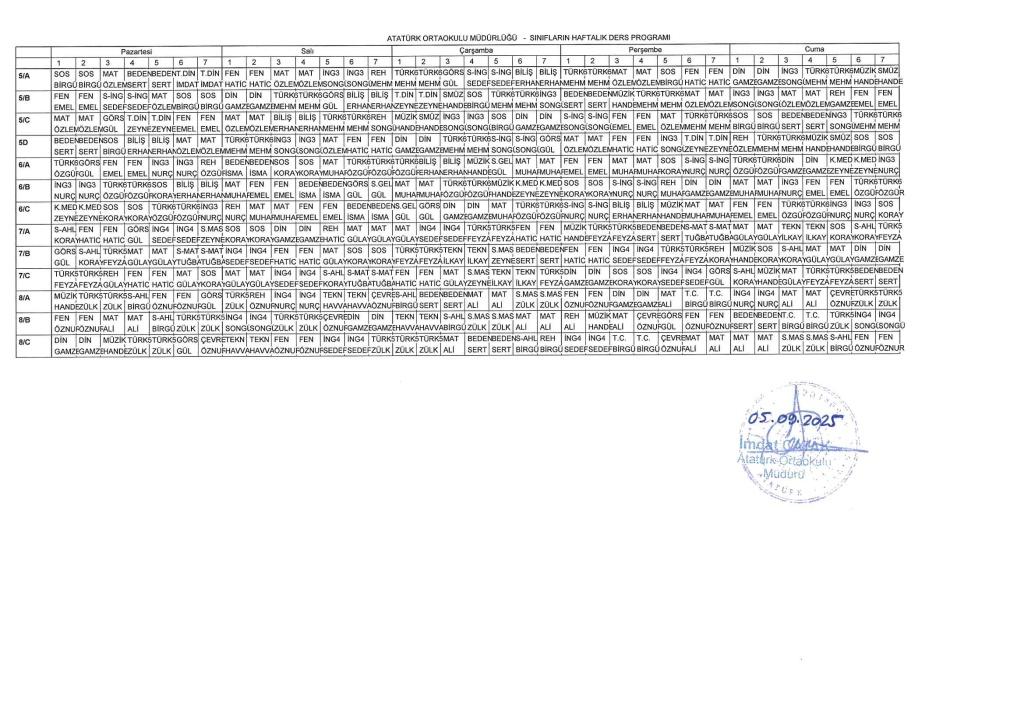 Haftalık Ders Programı 08.09.2025 Okulumuz öğretmen ve...